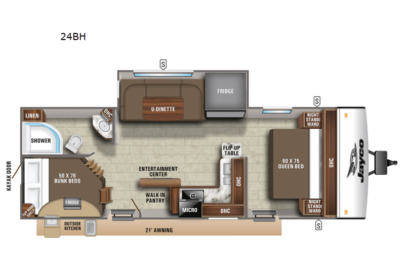 Goodyear tires (Made in the USA), 13,000 BTU A/C, 6 gallon gas/electric DSI water heater, aluminum rims, black tank flush, detachable power cord, enclosed underbelly, outside shower, power awning with LED lights, (4) manual stab jacks, AM/FM/Bluetooth® stereo, self-adjusting electric brakes, spare tire with cover, Fan-Tastic fan power roof vent, electric tongue jack, solar prep roof mount, sink cover/ drying rack, inverter prewire, 360 degree siphon, side camera prep, rear camera backup prep, JaySMART™ backup lighting, (2) 20 lb. propane bottles with auto regulator